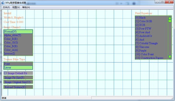 软件中含有近百种数学图像生成的算法,如Mandelbrot,JuliaSets之类的分形算法。首先介绍下该软件的基本功能,这是一款与图像有关的软件,所以图像加载显示功能是必需的,软件支持的图像格式有:jpg,jpg,dds,bmp,tga,ppm。用户可以将文件直接拖入窗体内以打开图像,也可以通过菜单项或快捷方式Ctrl+F选择文件加载。下图为软件界面: