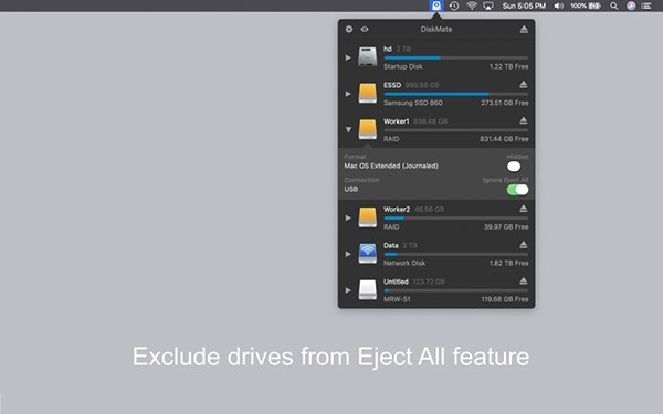 DiskMate Mac版是一款体积小巧的菜单栏应用程序。支持一键弹出你所有的正在Mac上的运行的磁盘驱动器,U盘存储硬件。一个点击弹出所有驱动器,当所有驱动器被弹出时,向用户提示声音,屏幕闪烁,提醒已拔出。DiskMate Mac版支持配置全局快捷方式以弹出所有驱动器,排除驱动器弹出的所有功能。你可以从列表中隐藏驱动器,参见列表中的总存储空间和空闲空间。使用状态栏图标轻松访问驱动器,所有的安装,卸载都会以通知形式告知用户。