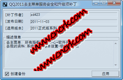 QQ2011去服务安全和升级项补丁使用于最新版的QQ2011,主要功能如下:.去主菜单: 所有服务+安全中心+软件升级项 .去我的资料:系统设置-基本设置-软件更新项