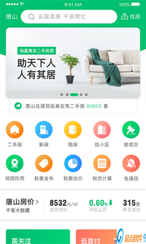 唐山千家房地产经纪有限公司(简称千家地产)已有15年的发展历史,是一家以地产经纪业务为核心的全国化发展的房地产综合服务体,作为河北省唯一一家在国家商务部注册备案的房地产经纪企业,品牌定位为“中国安心置业服务第一品牌”! 总部拥有9个部门组成的庞大职能中心作为千家地产的坚实后盾,秉承“助天下人,人有其居”的服务理念,为祖国人民能安居乐业而努力奋斗!千家找房,专业的二手房、新房买卖租赁大平台,提供海量真实房源信息。打破信息壁垒,为您提供市场行情分析、房源成交历史、带看历史,并告知您关注的房源、小区信息动态,让您不错过好房源!