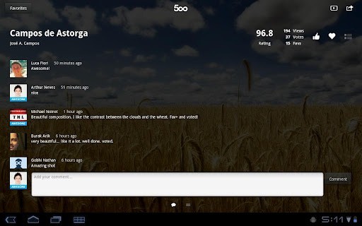 现在他们推出了自己的Android客户端,用户可以在自己的手机和平板机上安装使用。应用中可以浏览热门、编辑选择、分类等不同组合的照片,可以查看全尺寸的图片,登录账户之后可以查看好友和最喜欢的图片,并且可以为照片投票、收藏、评论等等。你也可以查看照片的相关信息,并且以幻灯片方式浏览美图。