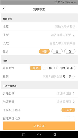 1、找人干活随时随地发布用工需求:一键召唤周边最靠谱工人,根据要求自动匹配合适技能,多维度依次排列。