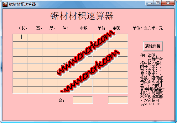 锯材材积速算器 V1.0.0.0 简体中文绿色免费版 锯材材积速算器是利用长方体体积计算方法设计,完全符合国家gb4814-84标准,可放心使用。使用方法:在空格中任意输入锯材检尺的长(单位米)宽(单位厘米)高(单位厘米)及件数即可计算出锯材的材积,省却了查看材积表以及材积表没有相应尺寸的烦恼,大大提高了工作效率,可同时计算多种规格的锯材材积。并可计算木材金额,不仅省却了翻看材积表的时间,也省却了计算器的计算过程。