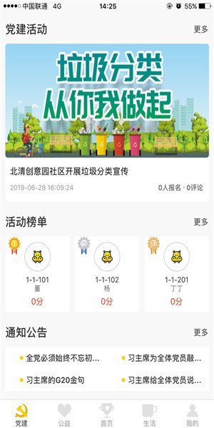 社区党建的动态展板[党建]板块,向社区居民及时传递党的温暖关怀,并将党建引领的社区各项活动的通预先知、场景瞬间等信息第一时间发布和记录在板块内,使社区居民生活能够更为紧密的围绕在党建的引领下。