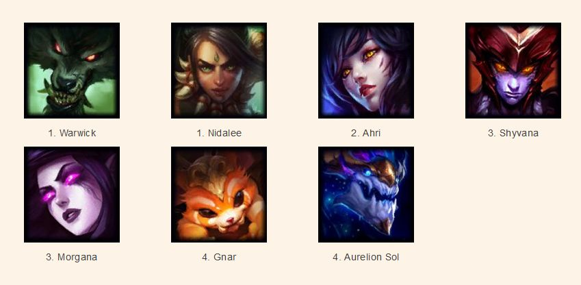狂野:【奈德丽(豹女)】、沃里克(狼人)、<阿狸>、雷恩加尔(狮子狗)、【纳尔】