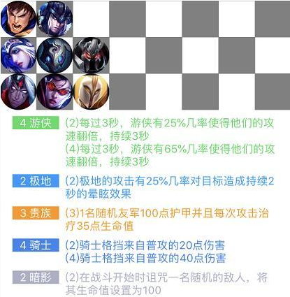 3个元素师便可召唤小菊,元素师本身是伤害输出,但是小菊非常的肉,在法系阵容中一般搭配元素师,加强前排。2护卫可以为周围的单位增加护甲,变相的将一些前排输出变为肉。在阵容实在没有前排的时候可以选择双护卫,建议阵容为冰川类阵容使用双护卫。2,4,6骑士分别可以让骑士本身格挡伤害20,40,80。格挡你可以理解为减普通攻击伤害。骑士是非常优质的前排,比较理想的搭配是4骑士4游侠,或者冰川类,龙法类。3变换师可以使变换师本身增加100%血量,纳尔一般作为变换师的核心前排肉+控制,搭配3变换师+装备可以肉的飞起,伤害也可观。理想的搭配是4狂野3变形,或者6约德尔。