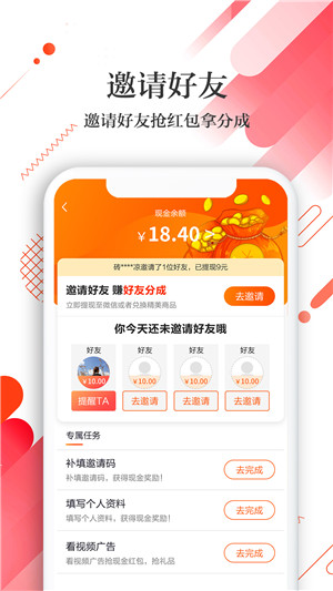1.邀请好友抢红包,自己也得分润,花解解开启躺赚模式。2.任务系统升级,做任务,赚红包,每天礼品拿不停。