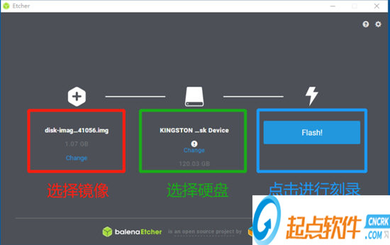 3、打开【BalenaEtcher】,选择在官网下载下来的镜像,选择需要刻录的硬盘,最后点击【Flash!】,等待刻录完成。