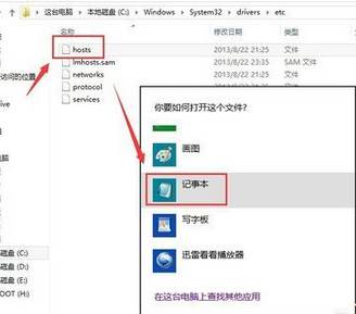 2、在“hosts”文件上单击右键,选择【打开方式】,然后使用“记事本”打开;