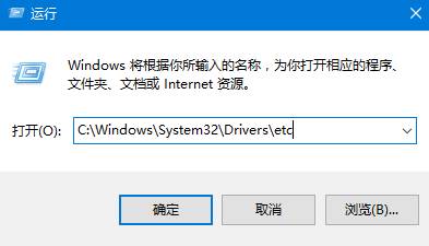1、按下【Win键+R】组合键打开运行,输入:C:\Windows\System32\Drivers\etc 点击确定;