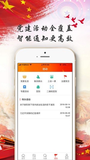 手机端参加组织生活、参与活动、发扬党内民主、履行党员义务平台。党委会、民主生活、集中学习、联系群众、三会一课、主题党日、签到、拍照上传、会议纪要上传