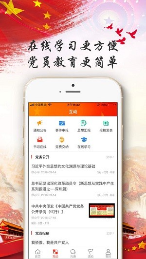 书记在线、会议(活动)通知、任务(事项)通知、问卷调查、在线投票、在线回复、沟通会话、热点讨论、思想汇报、在线评论、点赞、收藏、转发等。与组织沟通零距离