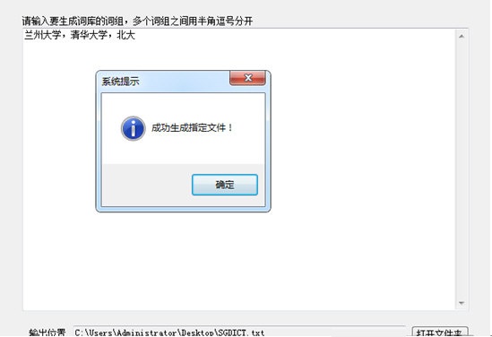 1、在文本框中输入要生成的词组,多个词组间用逗号分隔。(如:兰州大学,信息科学与技术学院) (建议:将常用词组如单位名称,员工姓名存放在文本文件中,\n\n后期可在此文件中不断增加,使用时从此文件中拷贝到本软件中)2、点击生成按钮,将会在桌面上生成文件“SGDICT.txt”。