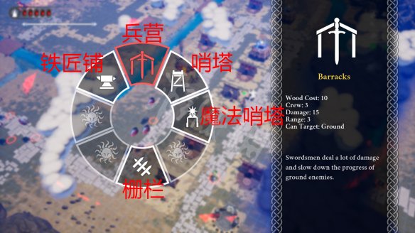 魔法哨塔-提供地面和空中火力支持,魔法哨塔可以驻扎两名士兵,伤害20,射程6,并且攻击有AOE效果。