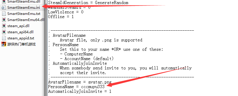 3,改名,游戏路径必须纯英文,改名才有效。记事本方式打开SmartSteamEmu.ini,找到下图的位置,改名。