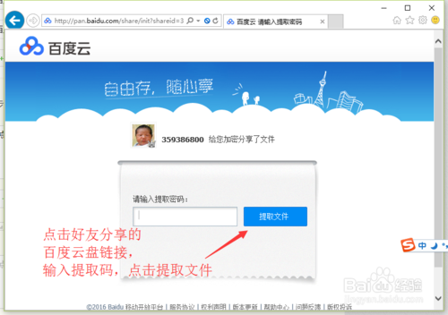点击好友分享的百度云盘连接,输入提取码,点击提取文件