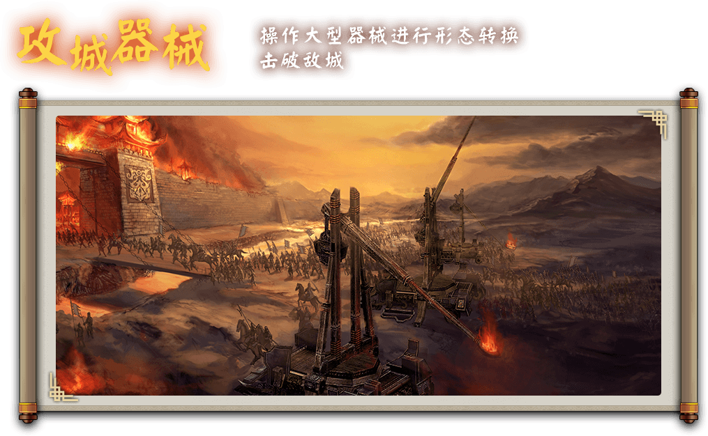 攻城兵器为《三国群英传2 网络版》的另一大特色,提供玩家驾驭战略等级的大型攻城兵器参战,不同的兵器还拥有各自的变形功能,如霹雳车能以高机动力的车辆型态行驶,待玩家一声令下,立即变形成炮击型态,以猛烈的火力支援攻城行动。
