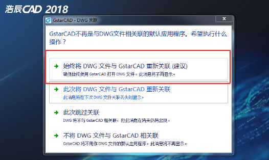 第三步:选择好版本后点击试用,这里是进行关联文件的设置,选择第 一个即可。进入软后后关闭浩辰CAD 2018软件。