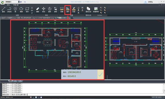 点击界面上方【面积】功能,根据命令提示,结合捕捉功能选择户型图的各个端点,选择一周组成一个封闭图形,回车之后面积和周长就显示在下方了。