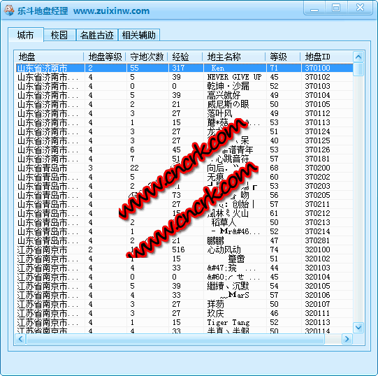 乐斗地盘经理是一款免费绿色的软件,他可以很方便快速的帮助你查询到第个地盘的领主的信息,领主的等级,防守次数,以及抢得该地盘可获得的经验,名去你一个个输入省份或者学校名称的麻烦使用方法,登录后,在空白列表处右键即可