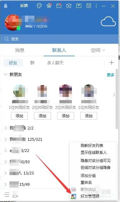 2、在打开的联系人窗口中右键点击空白位置,选择好友管理器菜单项