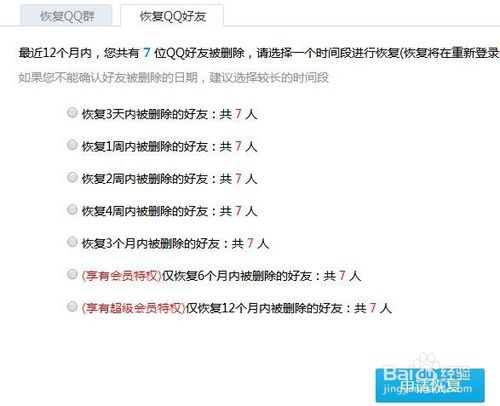 5、接着会打开恢复QQ好友的页面,在这里我们可以恢复对近12个月内删除的好友,选中相应的选项后点击恢复按钮