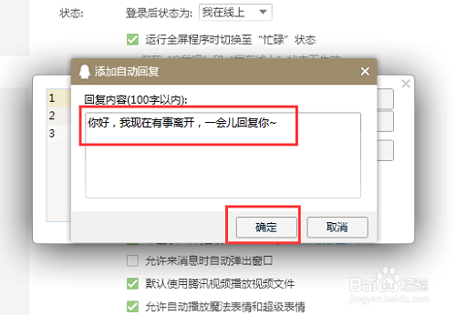 7、添加要自动回复的内容后,点击【确定】