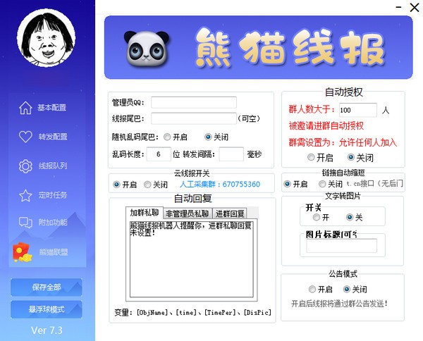 熊猫线报机器人是一款QQ的免费线报消息转发机器人插件,基于CleverQQ(原IR)实现,不仅有云线报,还有超强定时功能,任务应有尽有,更多功能等你来探索!【软件功能】