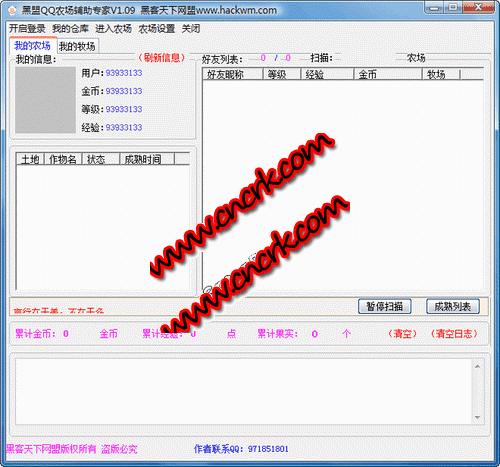 黑盟QQ农场专家制作此软件的目的主要是为了能更方便的操作qq农场,为您节约时间的同时给您的农场带来更高的收益.有了此软件您可以不用平凡的登陆qq空间来操作qq牧场.并且可以全自动为杀虫、收获、赶产。为您监视自己的牧场不被侵害,也同时为您监视好友牧场状态。实现了全自动化。