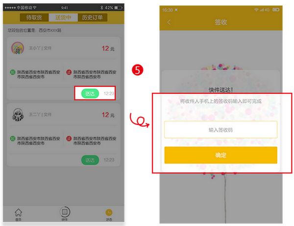 5、当快件送到收件人手中时,须在状态中找到相应订单点击确认送达,填写收件人手机中的签收码完成交易,等待收益入账。