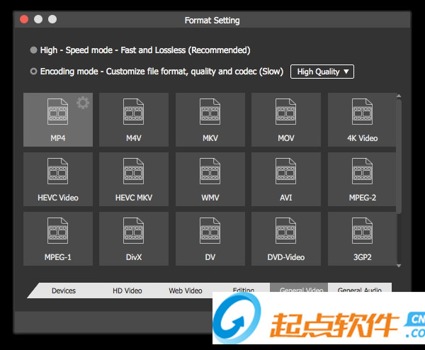 注意:设置输出格式时有两种模式可供选择。如果要在切割视频/音频时保持无损质量,则应选择高速模式。要将文件转换为其他格式,您应切换到编码模式。