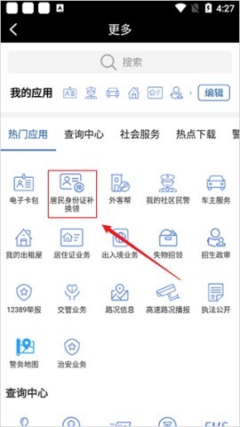 2. 随后找到居民身份证补换领功能,点击进入。
