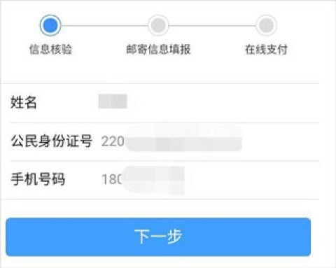4、系统将自动填入您的个人身份信息,确认信息准确无误后,点击“下一步”,接着填写身份证邮寄地址。