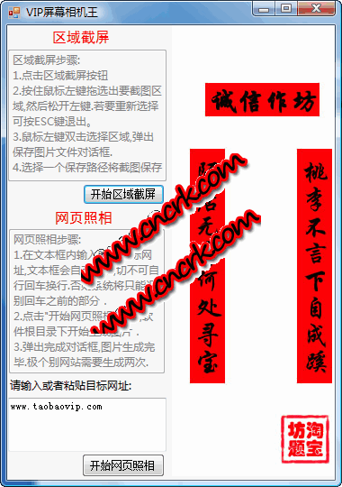 vip屏幕照相王可以任意截取屏幕上的显示内容,转化为图片保存.特有对任意网站页面进行完整页面拍照的功能.是各位店主或站长在整理宣传图片时不可缺的工具之一