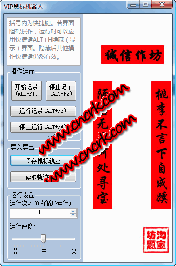 vip鼠标机器人是一个全自动的鼠标轨迹记录器.你可以用它来记录你的鼠标运行轨迹及点击情况,然后自动运行.可以设置重复运行的次数以及运行的速度.玩网络游戏的时候可以不用再对着重复的地方点鼠标到手抽痉拉!