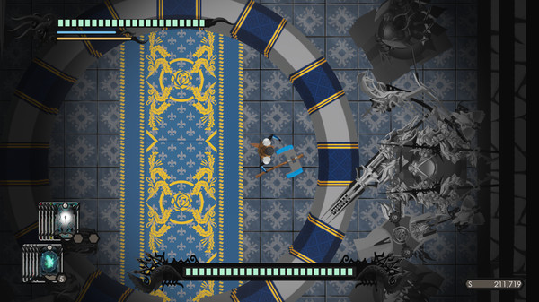 制作组为了照顾玩家设计了两个独特的系统(制作人通道)——“对刀”与“硬直条”。当玩家的攻击动作帧正好对上敌方武器的攻击帧时,玩家就会进入专注状态、移速、攻击力提高,体力回复,并给敌方带来大量的硬直。boss有个隐藏的“硬直条”,满了之后BOSS会进入任人宰割的虚弱状态,硬直条只要BOSS受到攻击就会累积,但在专注状态下累积更快,这个只针对boss的设定算是制作组对轻度玩家、stg苦手者的手下留情。