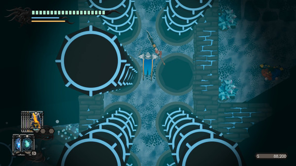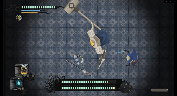 先从它独特的画面说起,我见过许多类魂3D游戏,见过各式各样的横版卷轴2D黑魂;但垂直视角的2D黑魂还真不多见。从天花板视角看,玩家所操作的主角像一个长方体,插了两只手,手上握着武器。简陋,辨识度却很强,为了防止玩家弄错游戏人物的朝向,制作组还为所有的护甲做了多种款式的披风。