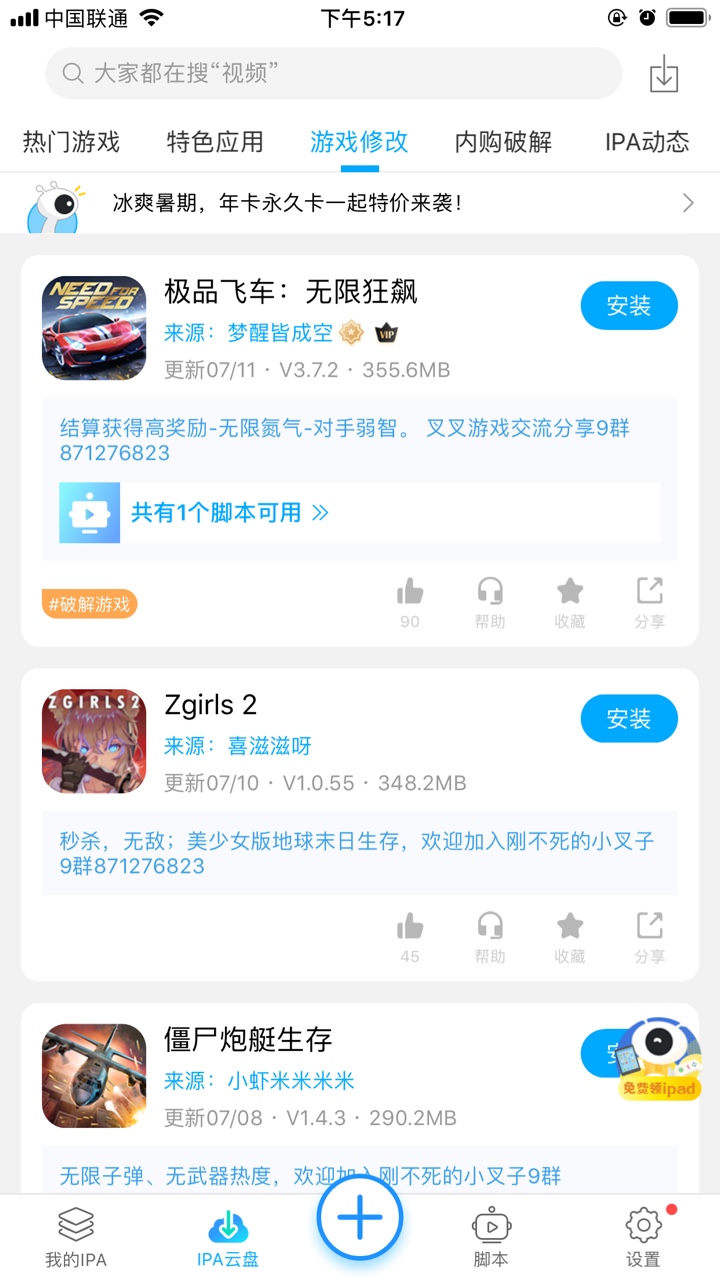 在叉叉IPA精灵中有十分丰富的云盘资源,玩家只需在云盘中搜索对应的游戏名,然后点击安装,进入到打包工具台,勾选需要的功能(脚本模块、加速器模块、多开等等)然后进行签名打包再下载到手机内安装即可。