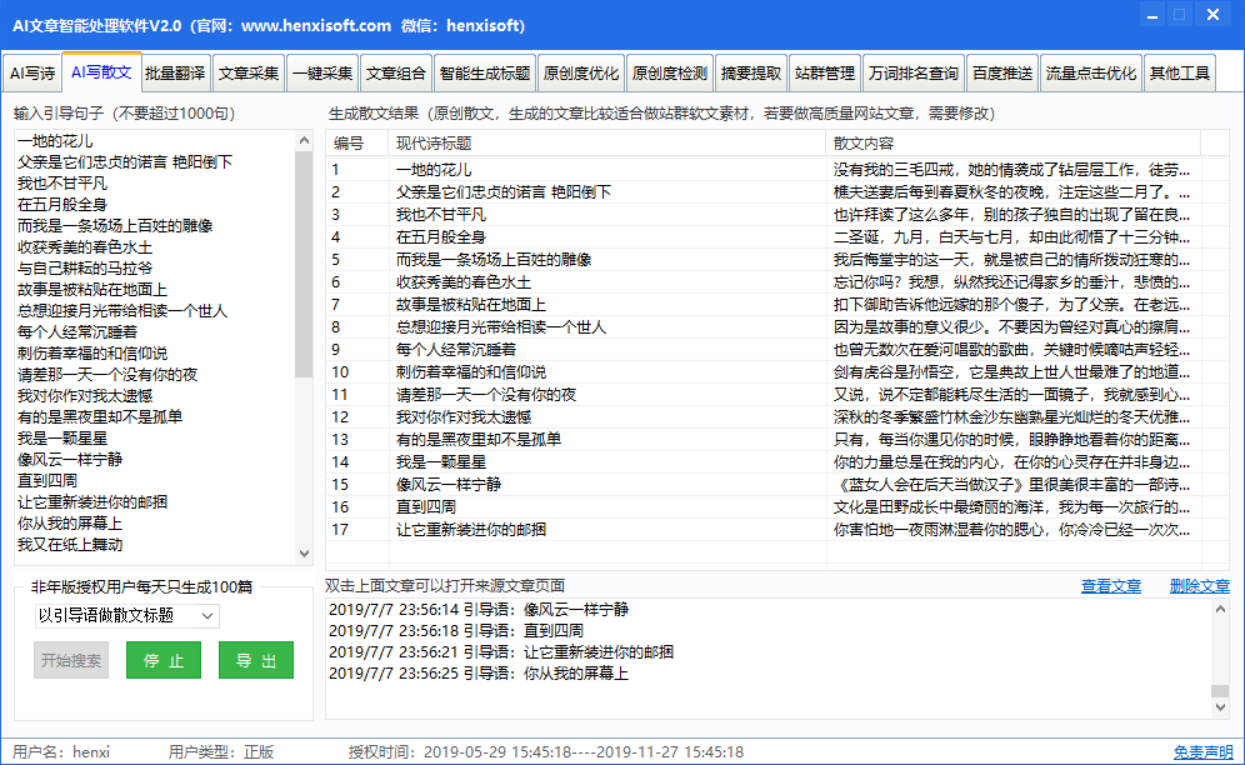 通过AI技术让机器学习大量散文写作技巧,然后根据用户输入引导句,创作出原创散文。这类文章可用于站群原创文章素材更新。由于散文是机器创作,偶尔出现不是很通顺的句子,这个属于正常,所以不要纠结这个问题,购买前先了解清楚即可。