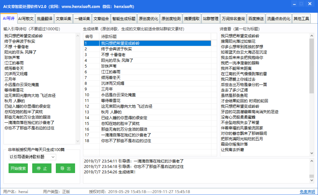 1、AI写诗歌通过AI技术让机器学习大量诗歌写作技巧,然后根据用户输入引导句,创作出原创诗歌。这类文章可用于站群原创文章素材更新。由于诗歌是机器创作,偶尔出现不是很通顺的句子,这个属于正常,所以不要纠结这个问题,购买前先了解清楚即可。