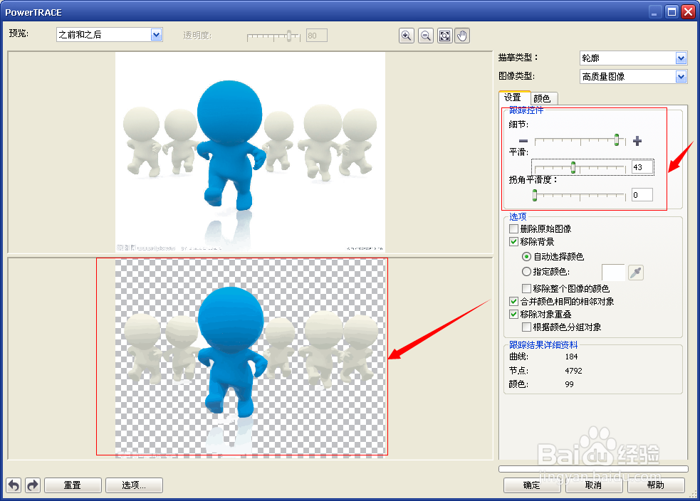 执行:位图——轮廓临摹——高质量图形,系统会自动对图片进行临摹,在右侧的跟踪控件下方可以调整临摹的细节,在原图的下方可以看到临摹后的预览图,调整满意后点击确定即可;
