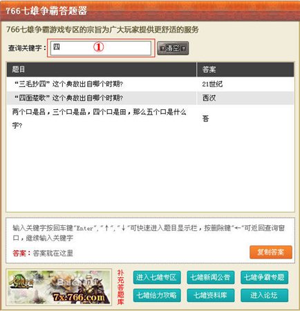七雄争霸答题器包含了智慧老人问题和答案。七雄争霸智慧老人的问题很多所以七雄争霸答题答案也很多,如果慢慢去找的话很困难。七雄争霸答题器能让你快速的找到答案,减少在七雄争霸中时间的浪费。