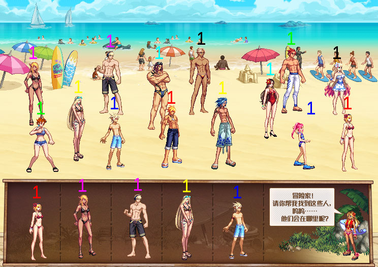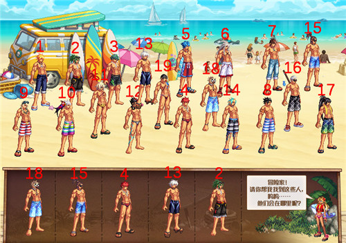 接着在游戏界面上部海滩找到对应的人物。如果找不到,可以使用小道具来帮助。