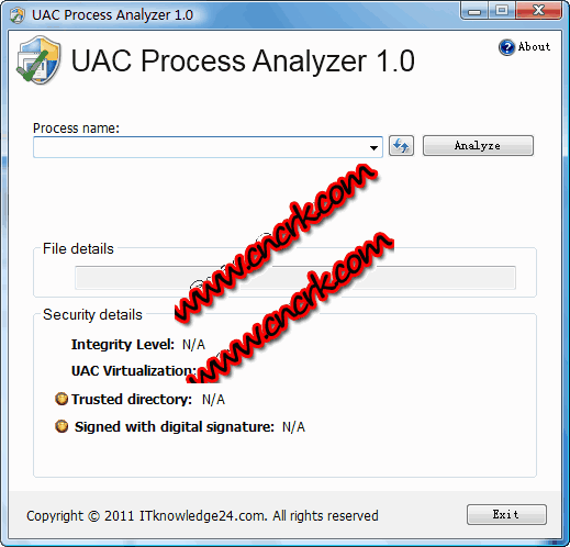 UAC Process Analyzer V1.0 英文绿色免费版 uac process analyzer是一个进程分析工具。可用来分析任何运行中进程的安全级别,包括完整性级别、uac虚拟化状态、可信活动目录及软件数字签名。支持32位和64位windows 7、windows vista操作系统。