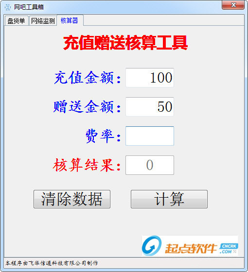 工具可以用来计算网吧快速计算充值赠送的实际金额。如,充100赠送 70,收费标准为 3.5元,那么实际费率是 100/((100+70)/3.5).该程序除此外,还有一些其它的计算。