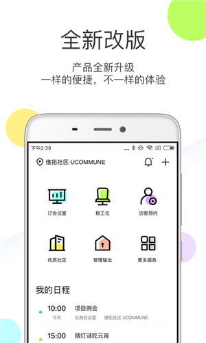 1、你可以通过优鲜集app实现预约参观和社区经理面谈,到现场感受优客工场的独特魅力,也可以为了出差或者会议来租赁一个临时工位或者会议室。2、针对长期入驻者,优鲜集app更是绑定了门禁卡,入驻者可以方便地实现漫游打印、会议室管理、设备报修等功能。