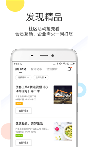 3、当然,更关键的是,在优鲜集app你可以触及优客工场所有的签约服务商,从企业核名到公司注册,产品宣传到风投融资,乃至于优客工场办公场地周边的配套生活服务,倾尽全力,只为降低创业与企业办公的成本,让你省下精力专注于最最重要的事,踏上事业发展的快车道。