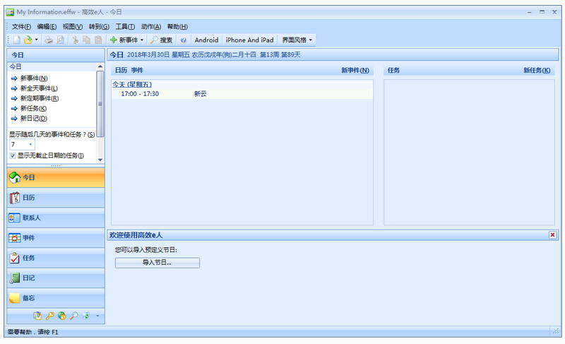 高效e人专业版(EfficientPIM Pro )是一款个人信息管理软件,可以帮助用户记录任务,联络人,提醒事项,密码和日记等信息。高效e人提供的大多数标准的PIM功能,如周期性活动,进口假期,导出为HTML ,任务管理和提醒,需要的朋友欢迎下载使用。【软件特点】