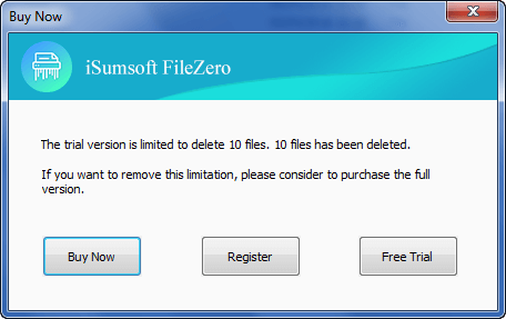 第4步:如果您正在使用试用版,它将弹出一个对话框,提醒您试用版仅限于删除10个文件。如果要删除的文件少于10个,只需单击“免费试用”按钮即可继续删除文件。但是,如果您希望一次删除10个以上的文件,则必须获取完整版本。