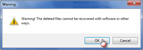 第5步:一旦触发删除按钮,将弹出一个警告对话框,警告无法使用软件或其他方式恢复已删除的文件。如果您确定要从计算机硬盘中完全删除这些文件,请单击“确定”确认。